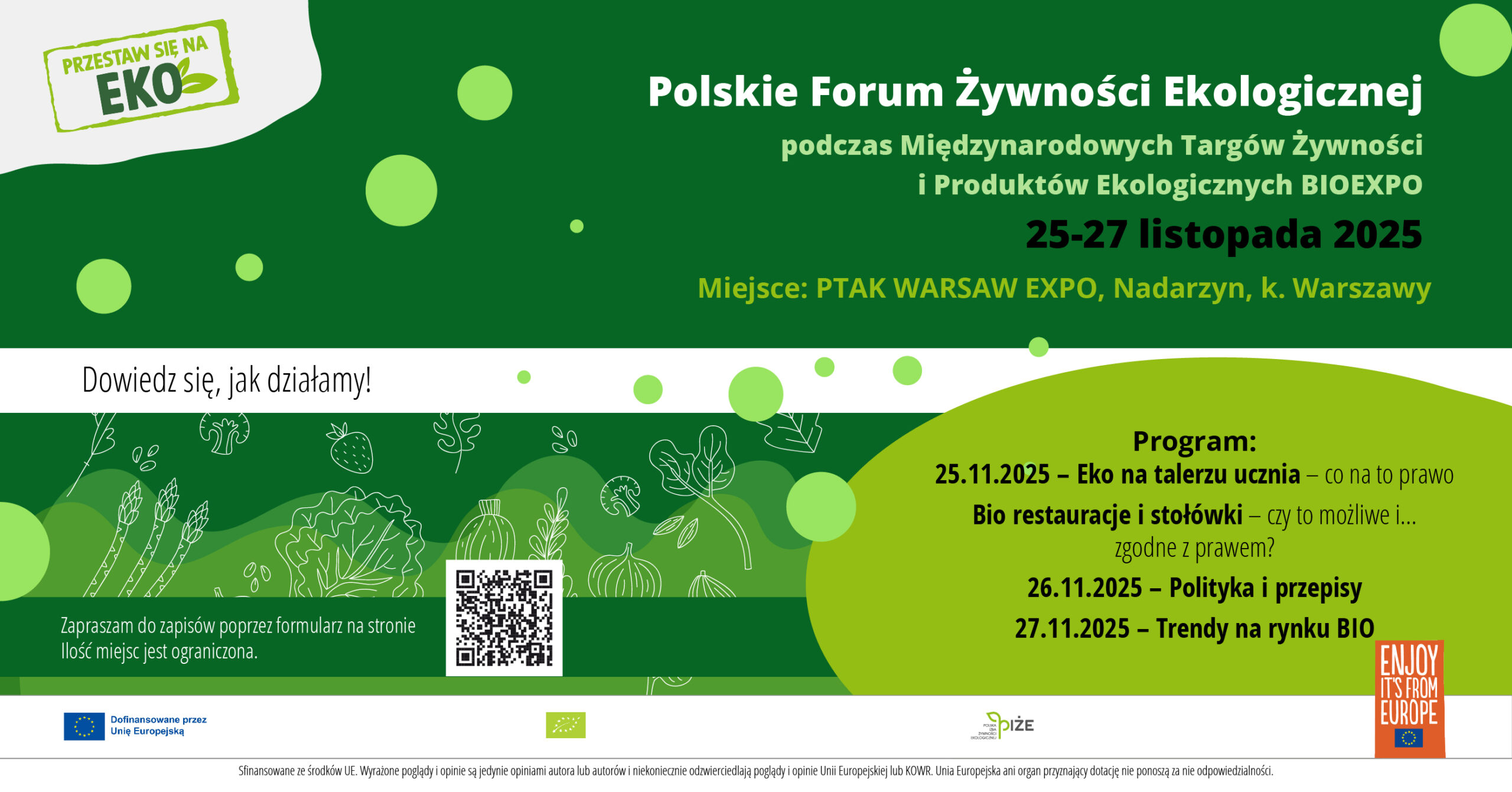 Polska Izba Żywności Ekologicznej jest współorganizatorem Polskiego Forum Żywności Ekologicznej – wydarzenia, które stało się ważnym miejscem wymiany doświadczeń, wiedzy i pomysłów dla całej branży bio. Podczas forum odbędą się cztery panele tematyczne, podczas których zaproszeni eksperci, praktycy i przedstawiciele administracji omówią kluczowe wyzwania i szanse stojące przed sektorem ekologicznym. Dyskusje obejmować będą m.in. rozwój rynku, kwestie legislacyjne, promocję żywności bio oraz edukację konsumentów.